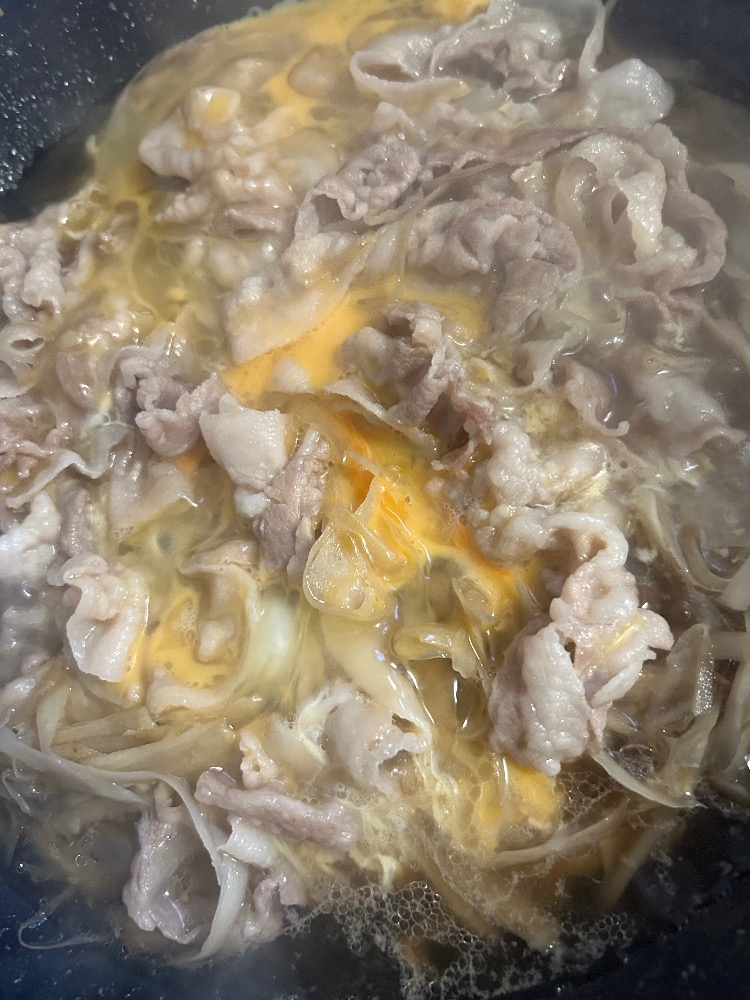 まあ要するにごぼうをだし汁で似て豚肉突っ込んで卵で閉じましたってご飯です🍚
