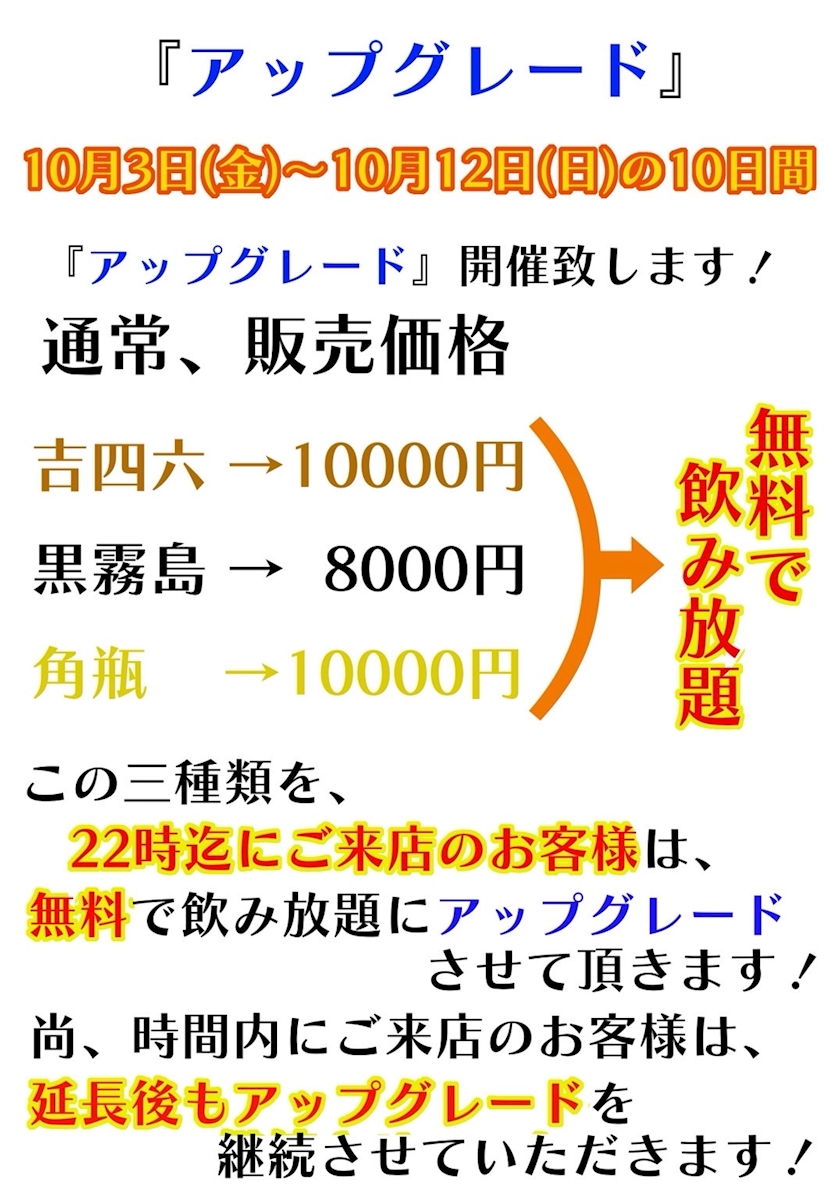 吉四六、黒霧島、角瓶が無料飲み放題なのは