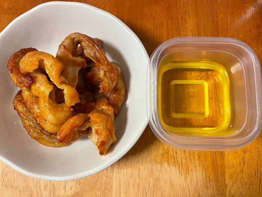 剥いた鶏皮が溜まったので鶏油とおつまみにしました🐔