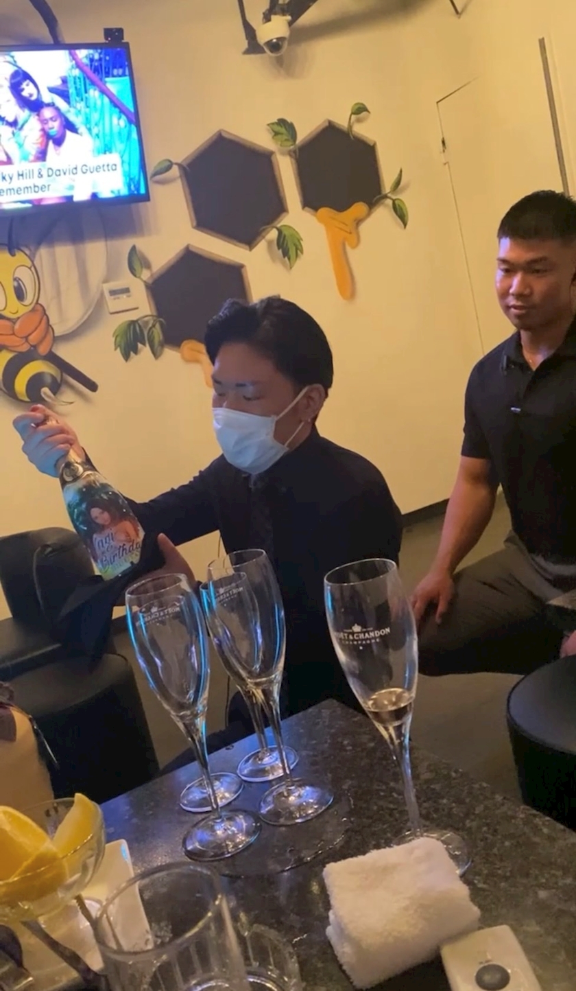 お誕生日の後祝いでシャンパンと