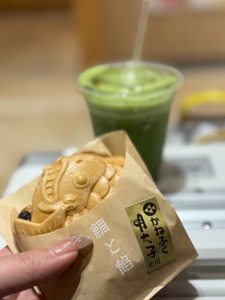 2人で鯛焼きを食べて抹茶を飲んで