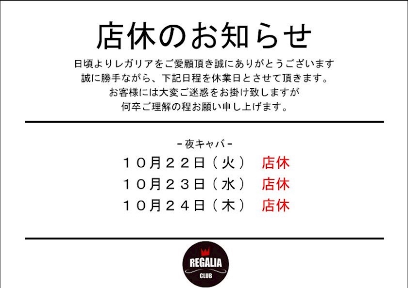 店休のお知らせ‼️ - 髭店長(毎日飲み歩きたい) - CLUB REGALIA・レガリア - 君津のキャバクラ