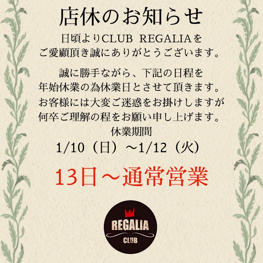 1月13日は1️⃣9️⃣時より営業致しておりますので年明けで皆様忙しいとは思いますがどうかCLUB REGALIAに是非ともお立ち寄り下さいm(__)m
