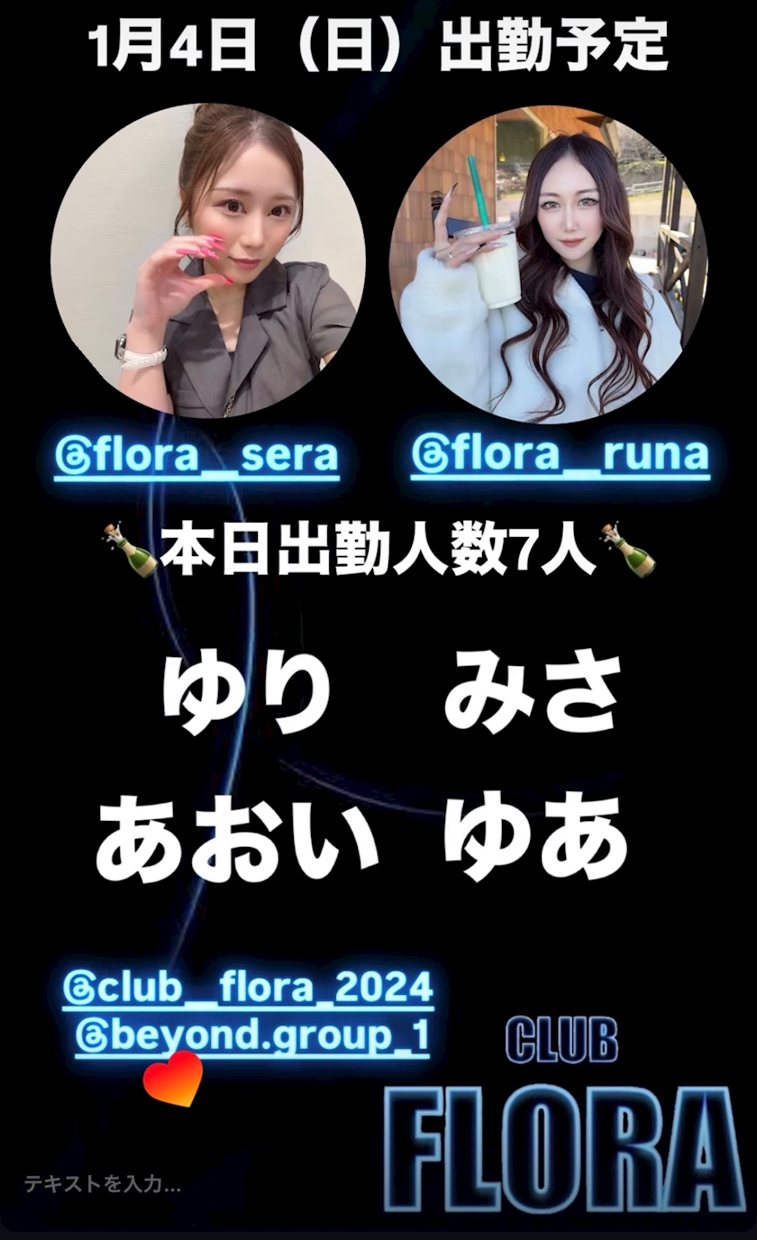 1月4日(日)出勤予定🗓️ - スタッフ - CLUB FLORA・フローラ - 君津のキャバクラ