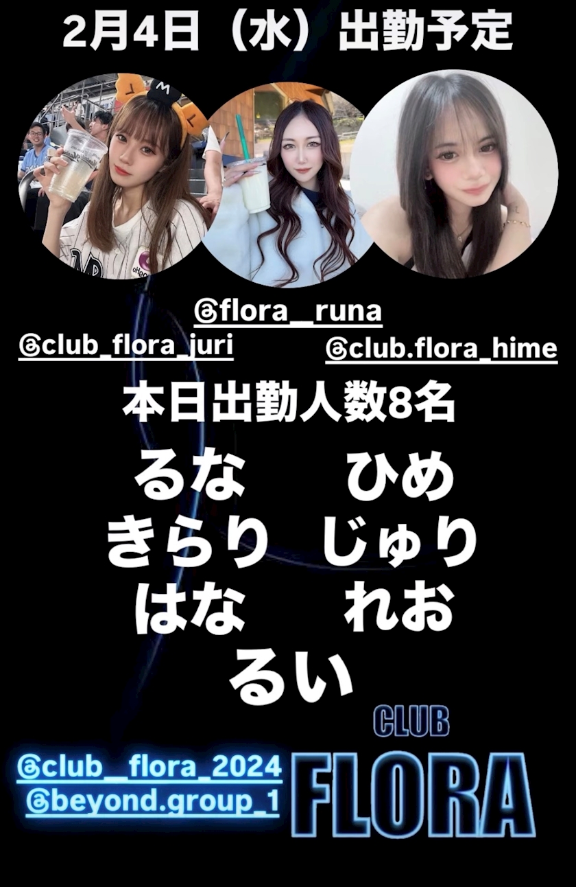 2月4日(水)出勤予定🗓️ - スタッフ - CLUB FLORA・フローラ - 君津のキャバクラ