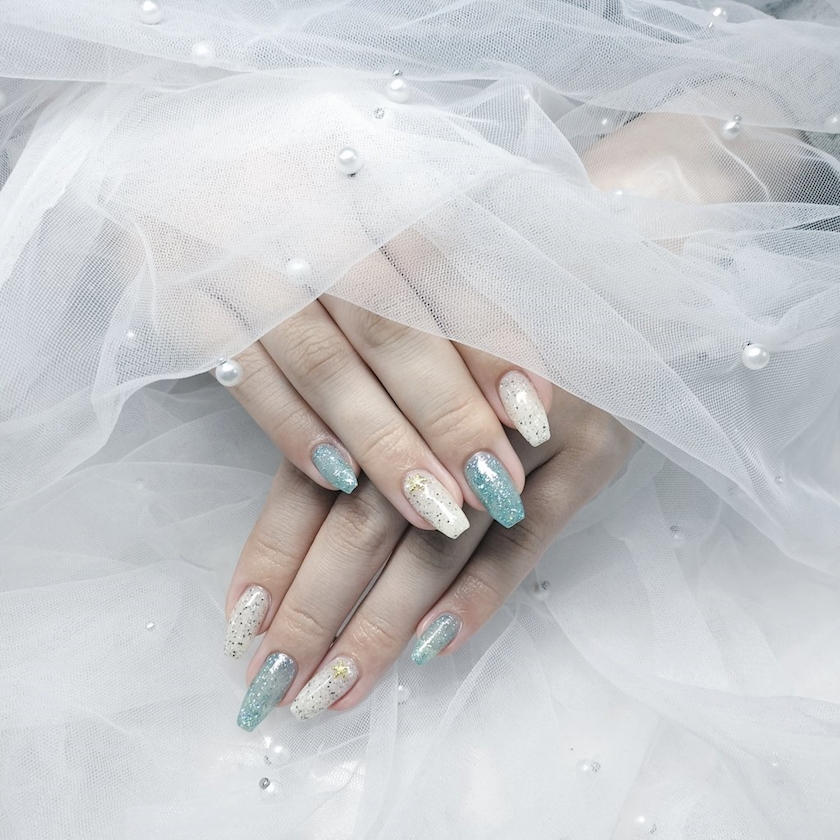 夏!って感じの配色でヒトデとパールがのってるデザインです✨