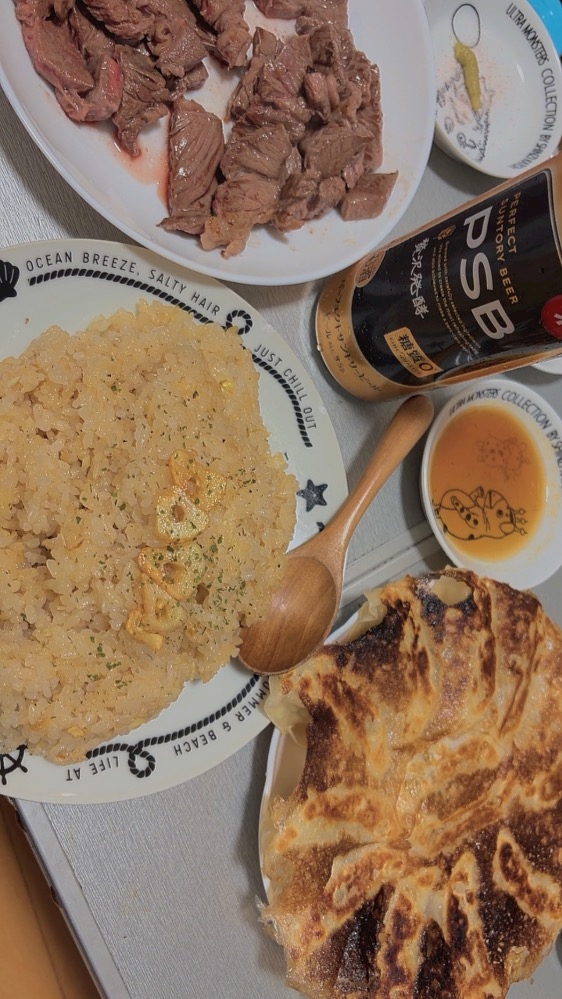 ガーリックライスに餃子にお肉にビールっていう
