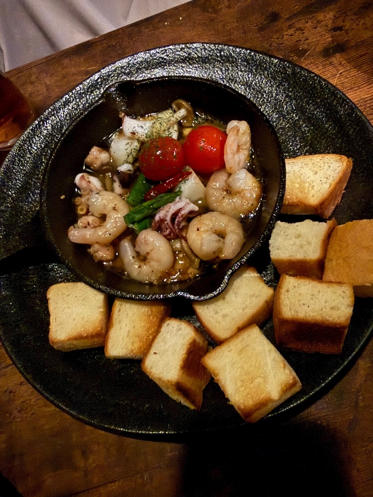 アヒージョとパン美味しい(*´~`*)ŧ‹"ŧ‹"ŧ‹"