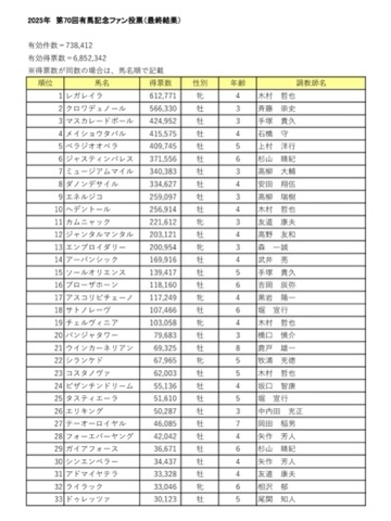 今年の 第70回有馬記念ファン投票の最終結果