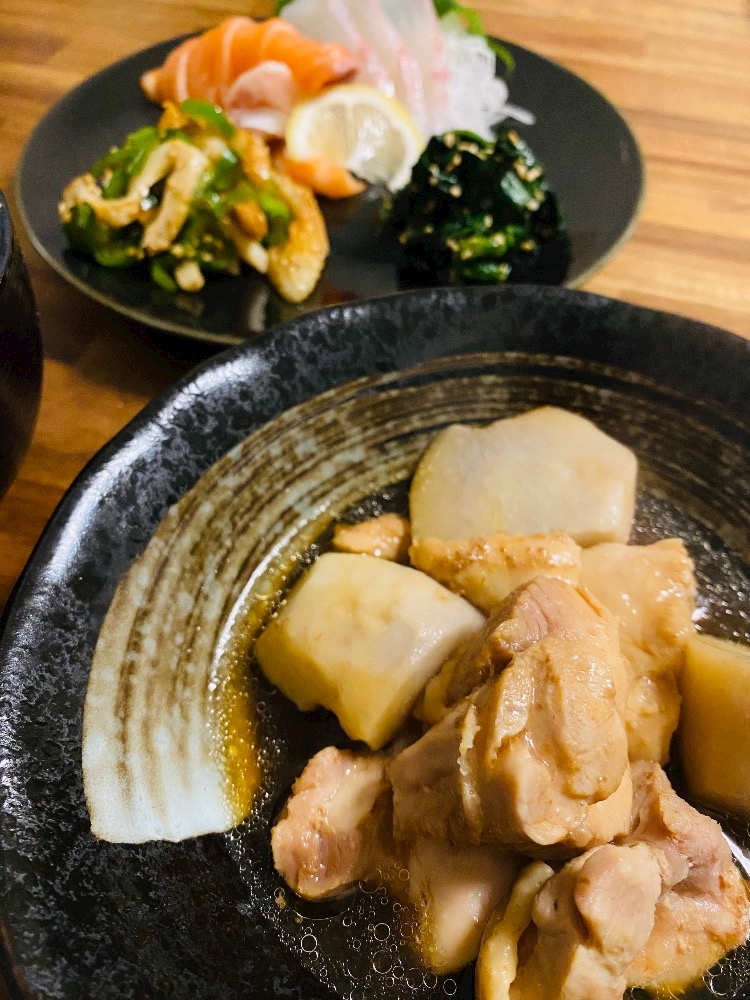 この日は里芋と鶏ももの煮物 (いんげん忘れて質素)と
