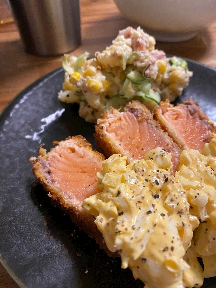 サーモンのレアカツを作って夜ご飯食べてきました🤍