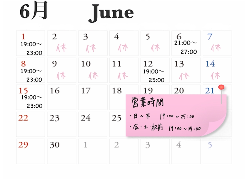 【月~木、日】19時~翌1時 【金・土】19時~翌3時 |