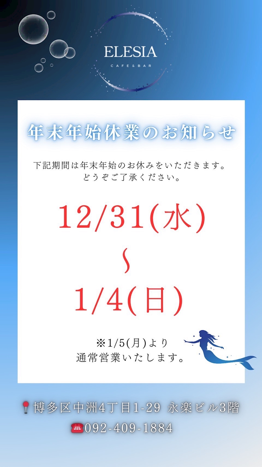 エレジアは12/31~1/4まで正月お休みです!