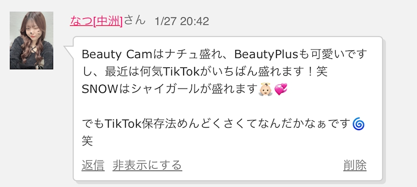 TikTokが加工良くて盛れるなーとは
