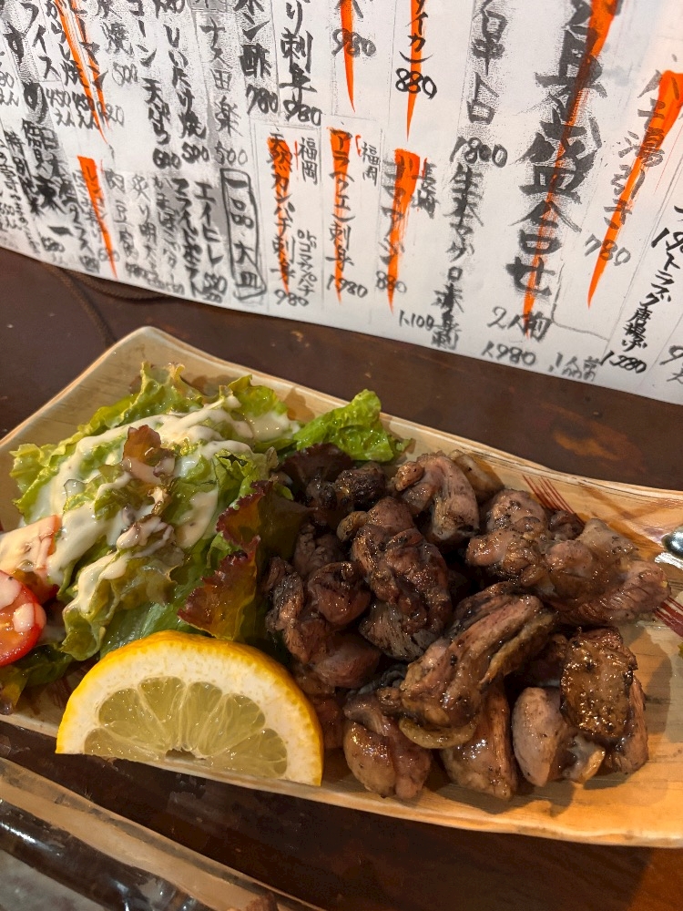 今日はお刺身と地鶏を食べて