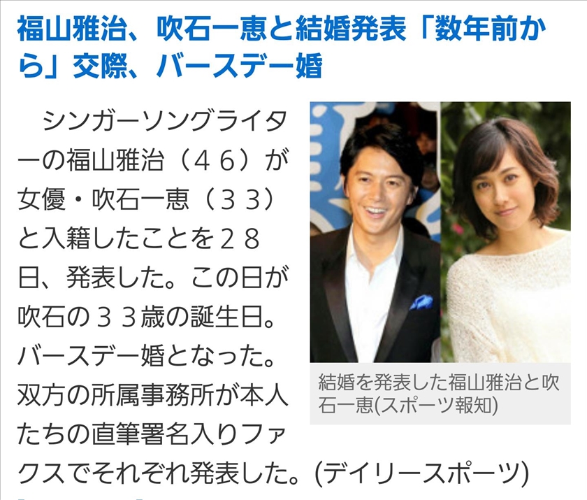 - 福山雅治さん、吹石一恵さん、おめでとうございます。
