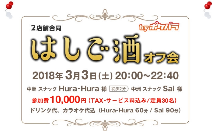 中洲のスナック「Hura-Hura(フラフラ)」「Sai(サイ)」2店舗合同での「はしご酒オフ会」になります!!