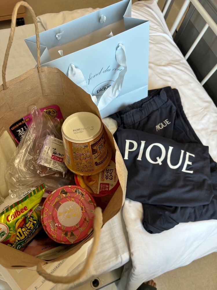 パジャマに沢山の嬉しい食べ物物資