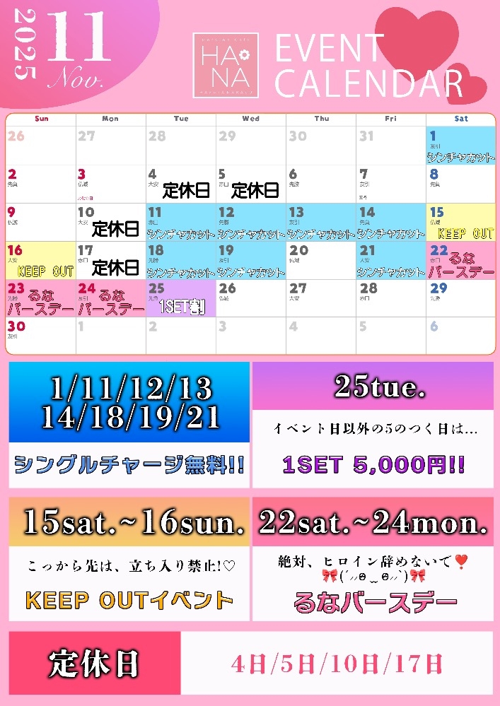 ✎*。11月𝕊𝕔𝕙𝕖𝕕𝕦𝕝𝕖 - 朝日奈 るな【ヒロインカフェ HANA】 - Heroine Cafe HANA・ヒロインカフェ ハナ - 中洲のキャバクラ