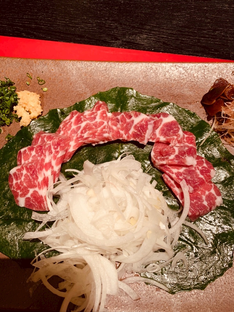 中洲で初めてこんな綺麗な馬刺し食べたって