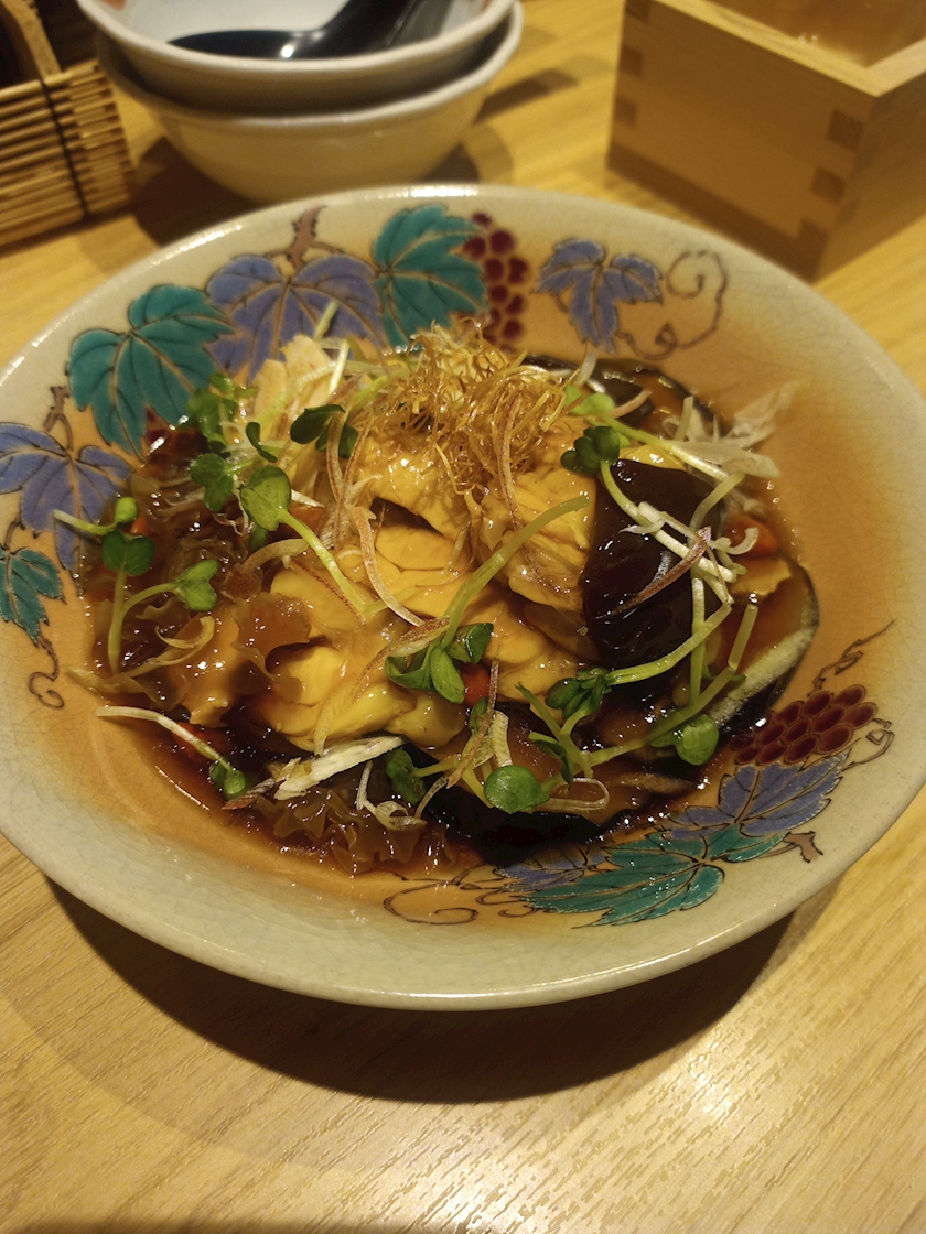 酒蒸し鶏と茄子の薬膳出汁仕立て