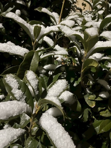 近所の葉っぱにめちゃ雪積もってた
