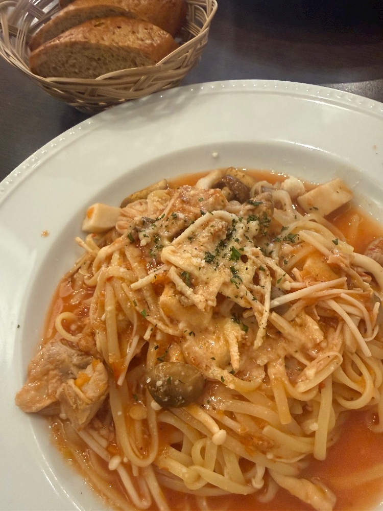 キノコと鶏肉のトマトソースパスタ🍅🍄