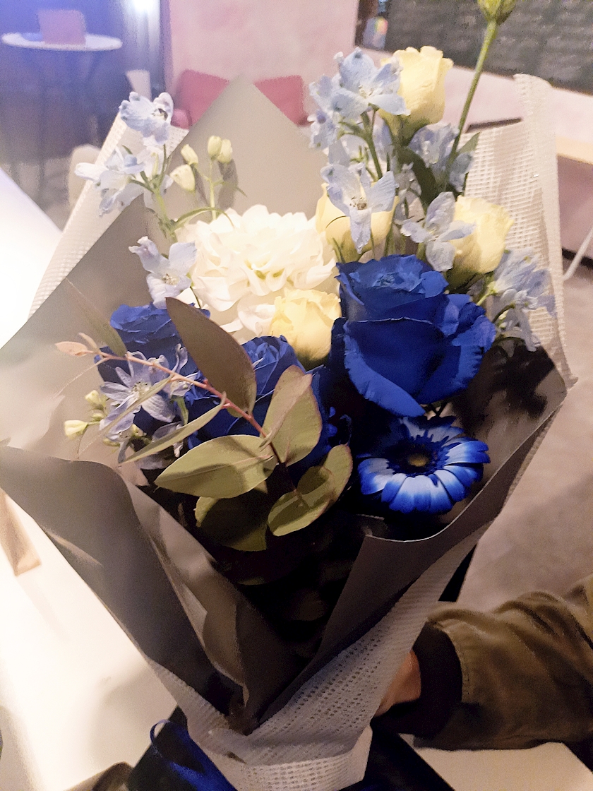 今日は誕生日のお祝いで青い花束や