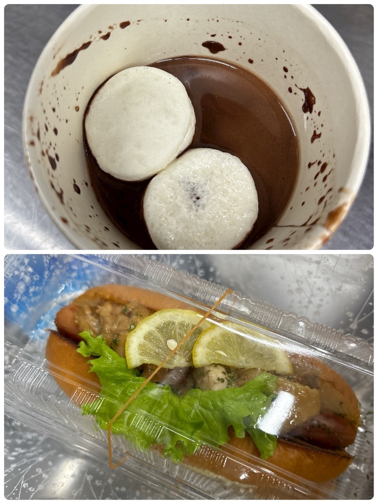 昨日昼職で頂いたホットチョコレート☕️(飲みかけ)とホットドック🌭