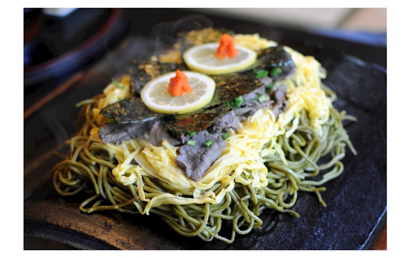 熱した瓦の上に、炒めた茶そばと牛肉・錦糸卵・海苔などを乗せ