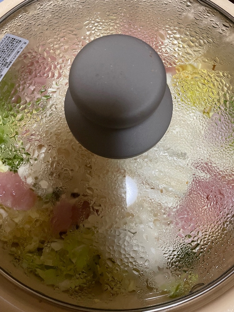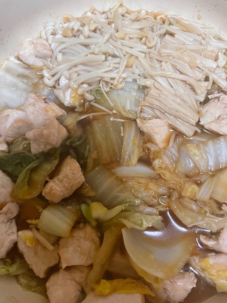 白菜(ちょい煮え)、お肉(ほんの少し煮え)、えのき(フレッシュ)の順に