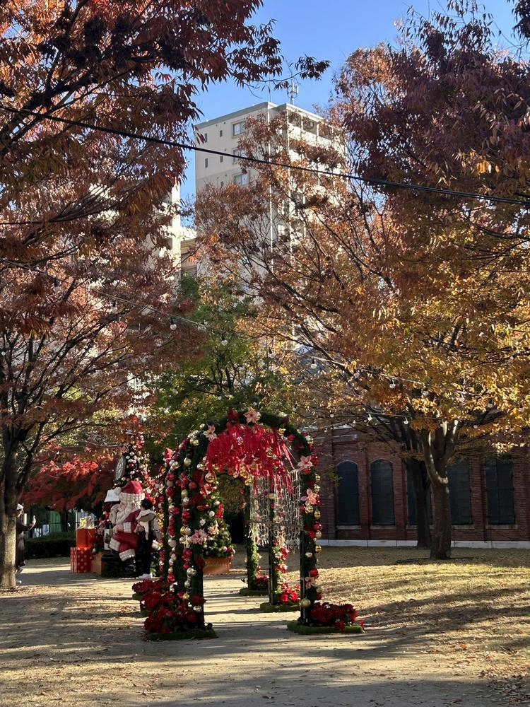 紅葉とクリスマスの装飾が