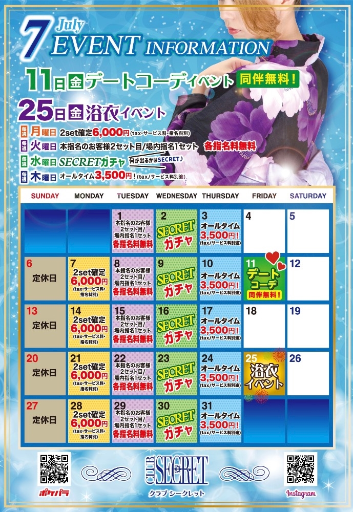 7月のカレンダー🗓 - かな - CLUB SECRET・シークレット - 岐阜 可児のキャバクラ