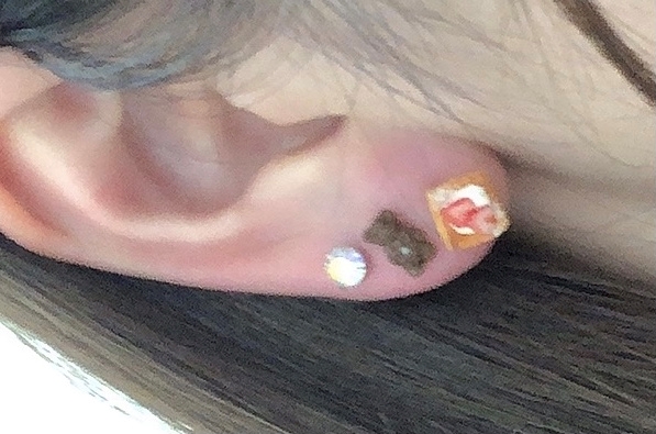 笑そんなリアルスイーツのピアスをつけてるので