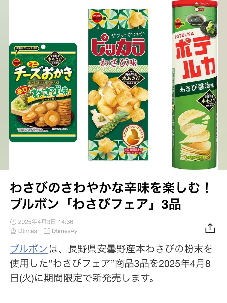 わさびのさわやかな辛味を楽しむ!ブルボン「わさびフェア」3品(Dtimes) https://u.lin.ee/og2TaPU?mediadetail=1&utm_source=line&utm_medium=share&utm_campaign=none