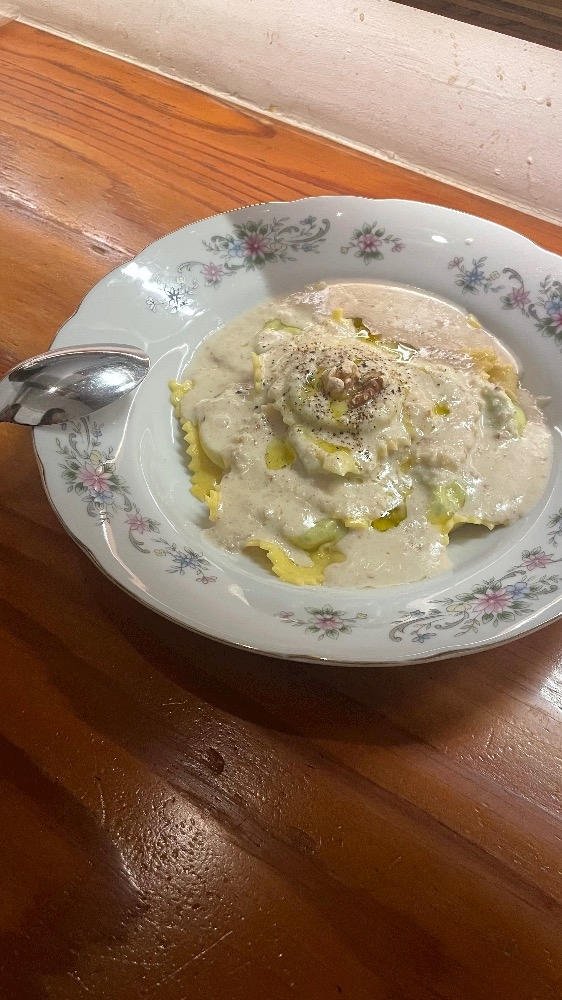 上 に は チ ー ズ と 胡 桃 の ソ ー ス が た っ ぷ り ♡