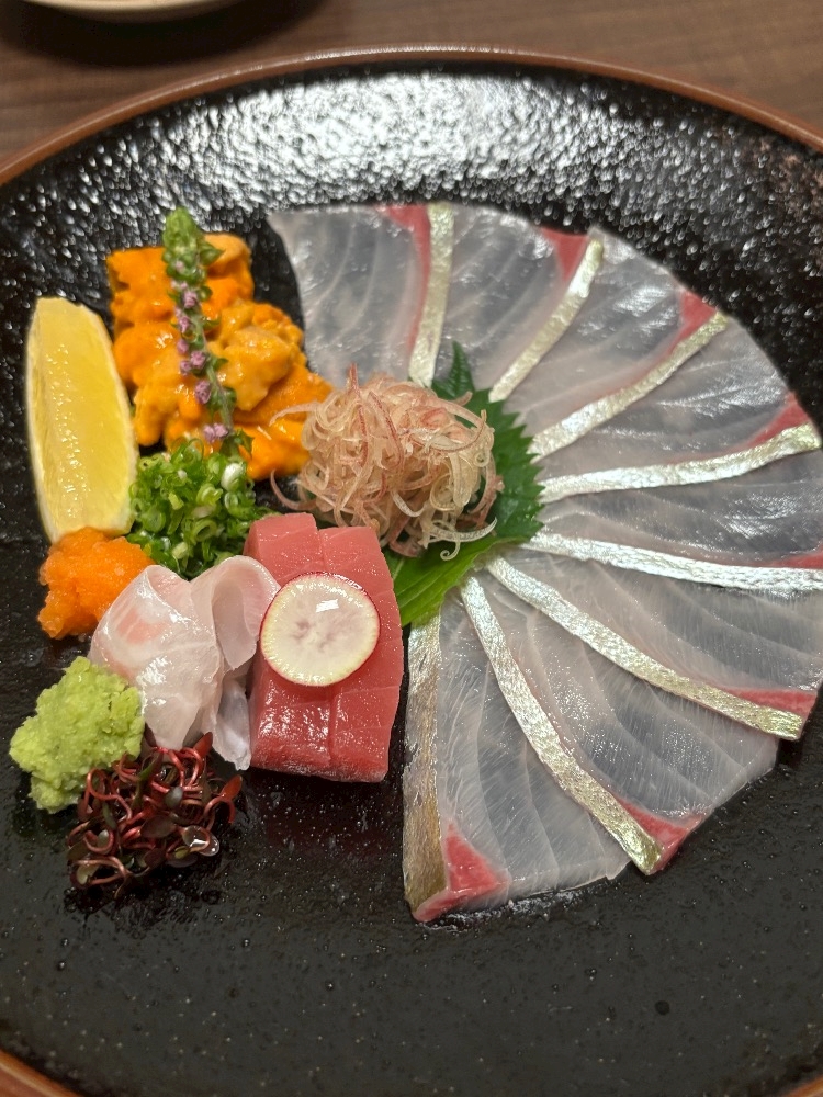 縞鰺のお造りと大好きなウニと