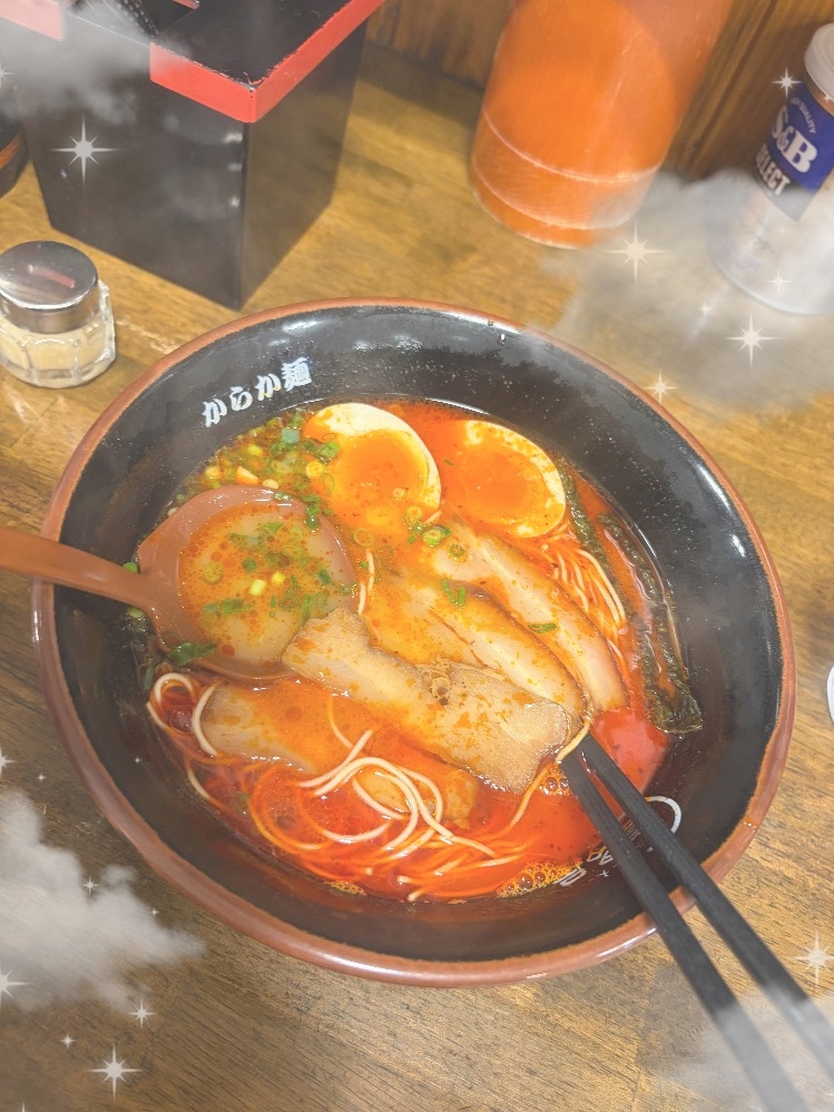 自分は辛いラーメンと餃子6個と半チャーハン頼んだけどすぐお腹いっぱいになるかなって思ったけど意外と全部食べれた👍🏻🩷