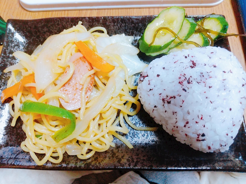 今日の晩御飯は焼きそば、ゆかりおむすび、きゅうりの漬け物です✨