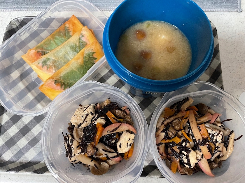 と、ひじき煮と、なめこと豆腐の味噌汁。