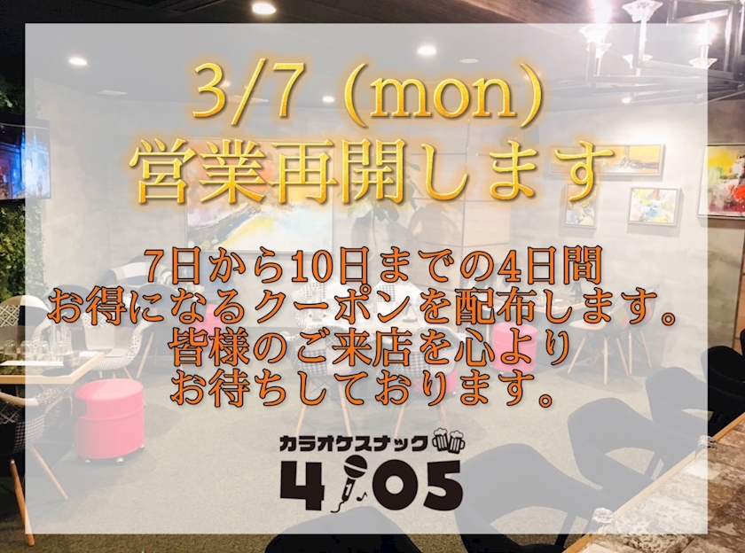 カラオケスナック4105、再開しました!!
