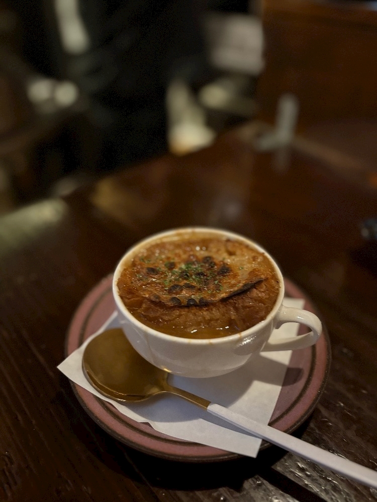 友達のご飯屋さんがオニオングラタンスープあるよって