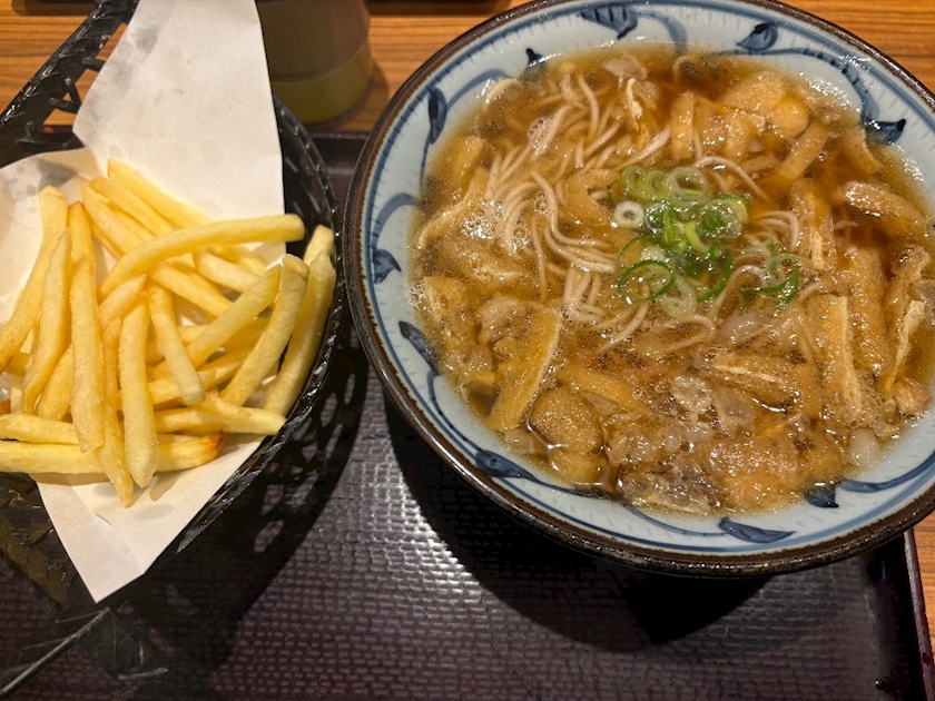 いつも阪急電車で行くんですけど十三で乗り換えするとき駅構内にあるそば屋でそこの名物のフライドポテトが乗ってるそば食べて行きました😃