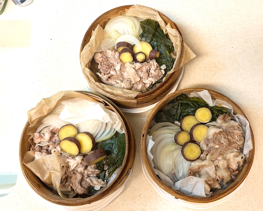 蒸し野菜(さつまいも、新玉葱、ほうれん草、豚肉)🥬