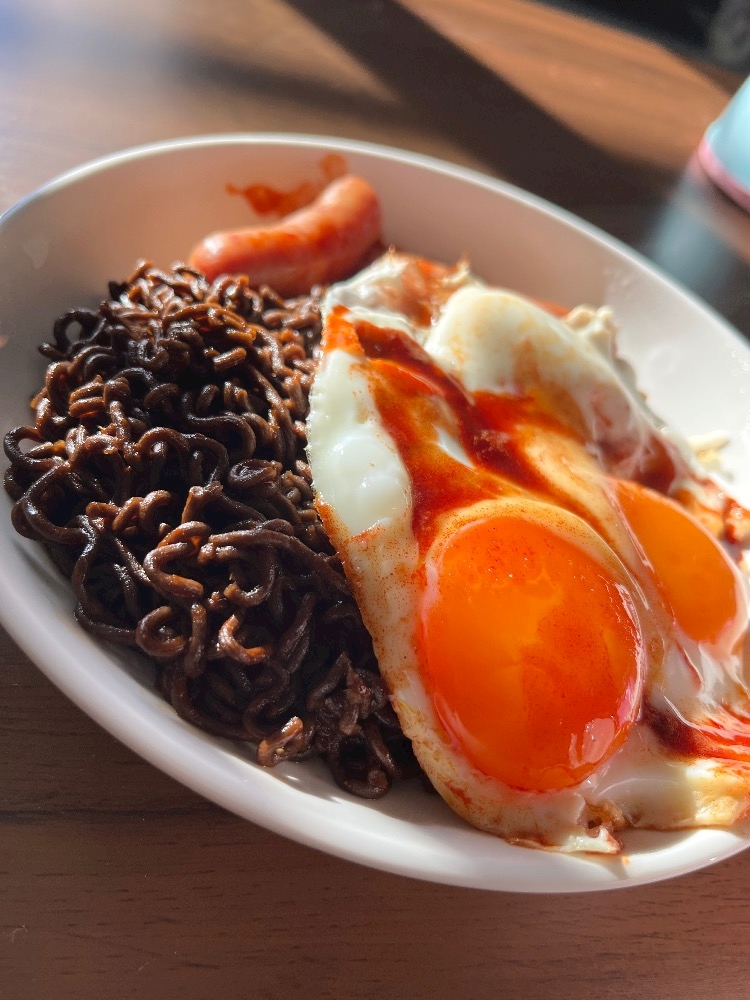 雑にウインナーと目玉焼きで食べました🌶🩵