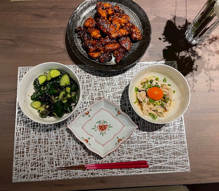 ヤンニョムチキン、きゅうり塩昆布、ささみ納豆