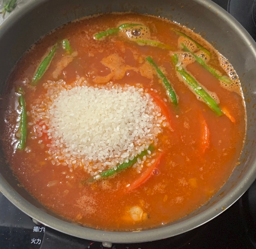 ⑤出汁とお米2合を加えて炊く