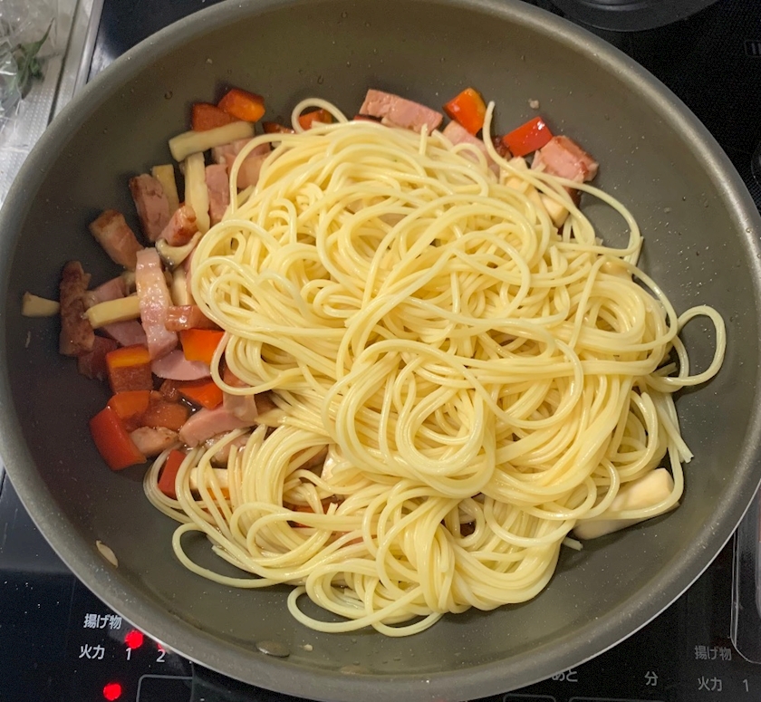 ②茹でたパスタを投入して味付け