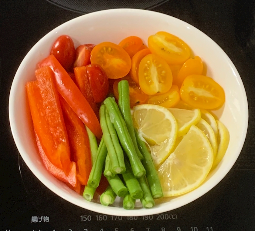 ⑥ミニトマトとレモンを乗せる