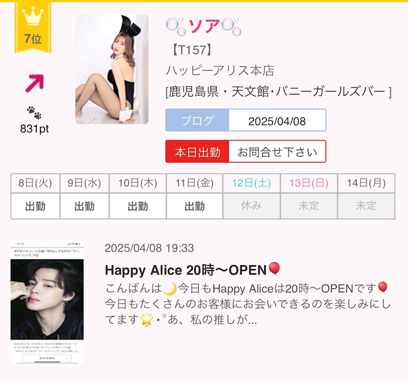 今日はお店閉めました‼️ランキング上がってて嬉しい🎶 - 🫧ソア🫧 - ハッピーアリス本店 - 鹿児島県・天文館のガールズバー